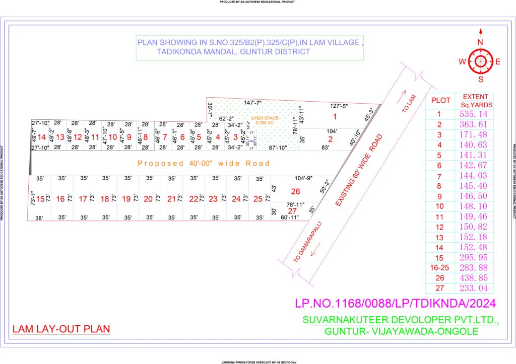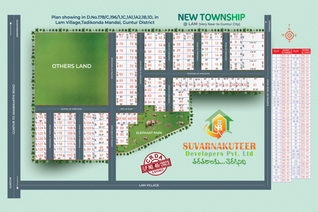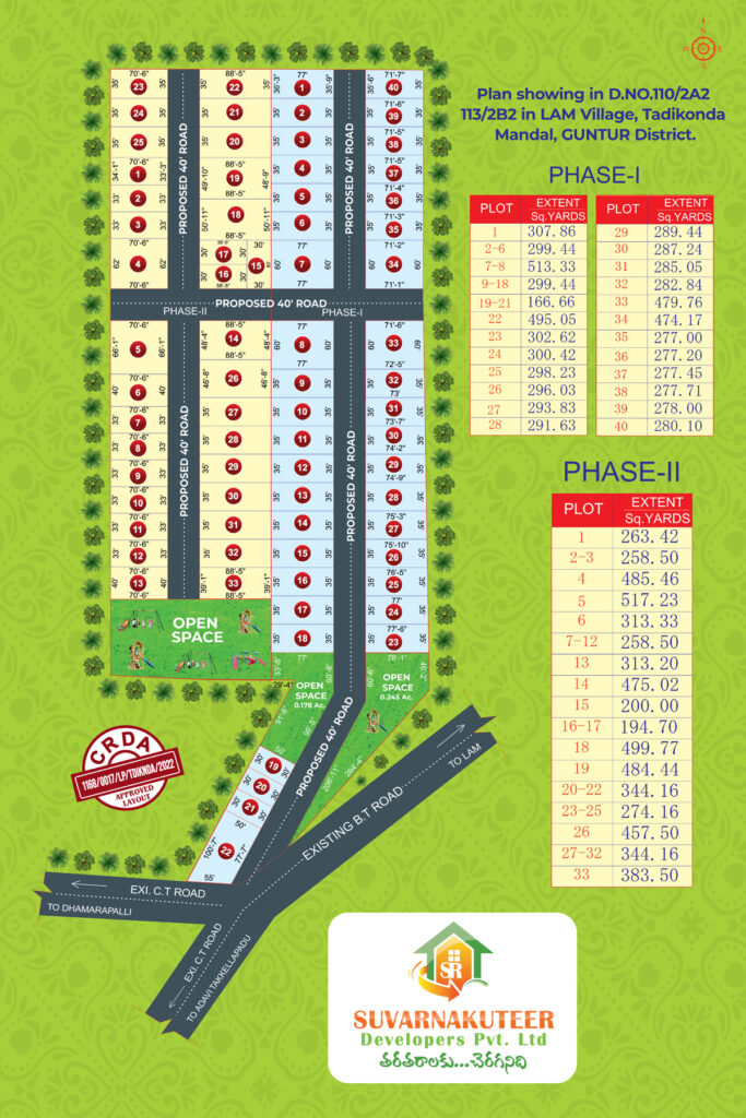 Discover Suvarna Kuteer – Lam, a well-planned residential open plot project developed by Suvarna Kuteer Developers Pvt. Ltd., located in Lam Village, Tadikonda Mandal, Guntur District. Offering premium CRDA approved plots in Guntur, the layout is designed for peaceful living and long-term investment growth, with legally clear residential plots in a prime and steadily developing location.