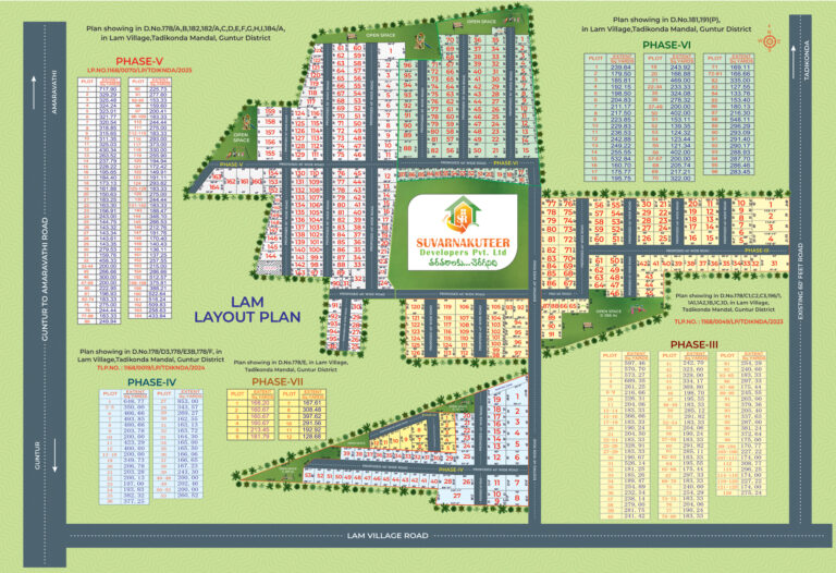 Located in a rapidly developing area of Tadikonda Mandal, Suvarna Kuteer – Lam offers strong potential for future appreciation. With Phase I to Phase V completed and Phase VI, VII & VIII currently available, the project presents a valuable opportunity for both end-users and long-term investors.